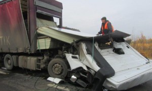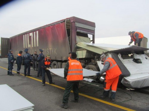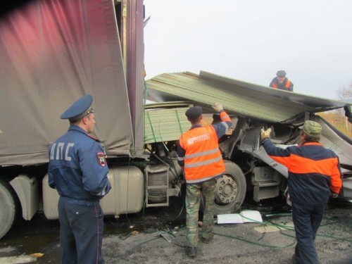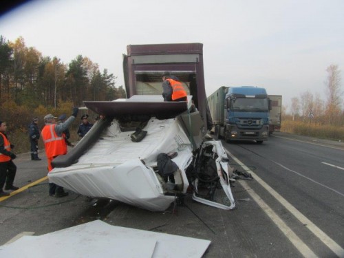 В 14:48 водитель произвел экстренное торможение. В результате груз пробил переднюю стенку фуры и смял кабину автомобиля.