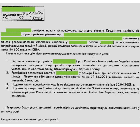 Мало того, пройдя «огонь, воду и медные трубы» так называемой аккредитации, для того, чтобы Страховщик имел право работать в том или ином Банке он ОБЯЗАН(!) привести ему клиентов на сумму кредитования не менее энного количества тыс. или млн. грн, открыть расчётные счета своих структурных подразделений в Банке, разместить от 1 млн. грн. и выше депозитов (о ставках отдельный разговор) и т.д. и т.п., в зависимости от «внутренних стандартов Банка по работе со страховыми компаниями» (!) Не верите?