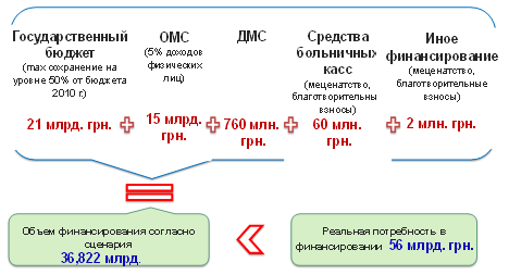 Наиболее привлекательными для чиновников стали проекты системы медицинского страхования, при которых страхователи в лице государства, работодателей юридических и физических лиц будут платить взносы в обязательный социальный фонд страхования или другое объединение. По прогнозам экспертов, при такой схеме страховщики не будут иметь никаких гарантий эффективного использования этих средств, поскольку дальше денежные потоки будут находиться под контролем нереформированной системы медицинского обеспечения МОЗ. Это приведет к тому, что отрасль опять поглотит все ресурсы, не повысив качество обслуживания. Предварительные расчеты показывают, что если государство оставит бюджетные средства для финансирования медицинской отрасли на уровне 21 млрд. грн. и дополнительно решит ввести 5% налог из доходов физических лиц, это не позволит покрыть необходимые затраты на систему здравоохранения.