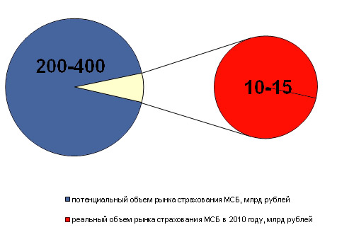 По оценкам «Эксперт РА», потенциальный объем рынка страхования малого и среднего бизнеса составляет 200-400 млрд рублей. При этом в 2010 году страховщики собрали 10-15 млрд рублей страховых премий в этом сегменте. По прогнозам «Эксперт РА», в 2011 году объем рынка страхования МСБ составит 13-18 млрд рублей.