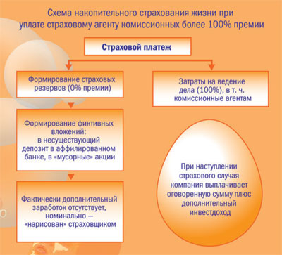 Некоторые компании доходят до того, что выплачивают комиссионные «авансом» за весь период действия договора страхования. «В текущем году аппетиты таких компаний выросли — они выплачивают до 240% комиссионных в первый год. Это не ошибка или безумие, это разновидность финансовой пирамиды для выполнения плана по фиктивным сборам премий»,— рассказывает председатель правления СК «УСГ Жизнь» Оксана Голеншина. Например, клиент должен уплачивать страховой компании в течение десяти лет оговоренную сумму ежегодно. Соответственно, агент будет получать минимум 30% своих комиссионных ежегодно по факту получения страховщиком денег от страхователя. Но компании поступают иначе: они плюсуют комиссионные, допустим, за первые пять лет действия полиса, и платят их агенту сразу же. А это — 150% страховой премии. Если же компания пообещает агенту 100% премии за каждый год, ей придется «раскошелиться» на 500%!