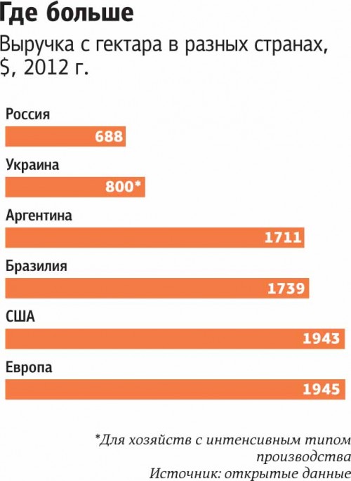 Единственное, что сдерживает победное шествие АПК, — низкая эффективность украинского аграрного сектора. По оценкам аналитиков, средний показатель прибыльности с гектара в Украине (с учетом необрабатываемых земель) составляет около $200. Для сравнения: в среднем по миру выручка с гектара составляет около $1550.