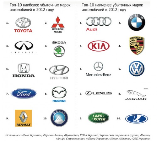 Неожиданностью стало присутствие в рейтинге безубыточных корейской Кia. В прошлом году украинцы купили таких авто на 73% больше, чем в 2011 году. Продажи машин этой марки выросли с 9-го до 3-го места, при этом львиную долю составило бюджетное предложение Kia Rio. Рост реализации полисов автострахования для таких авто в прошлом году несомненно должен привести к росту выплат по ним в нынешнем. На рынке СК также ожидают увеличения выплат и по машинам марки Volkswagen в связи с их популярностью в Украине и повышением цен на ремонт в 2012-2013 годах. Итогом таких ожиданий может стать рост тарифов на данные марки автомобилей на 2-3%, но это произойдет уже по итогам 2013 года.