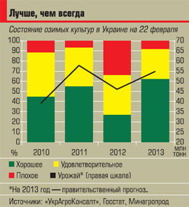 Нынешнее состояние озимых является лучшим за последние десять лет. По данным Министерства аграрной политики и продовольствия, в хорошем и удовлетворительном состоянии находится 92% посевов (в прошлом году — всего 67%, а урожай был одним из лучших за весь период независимости, см. «Как посмеем, так и пожнем»). «Используя благоприятные условия увлажнения почвы, хозяйства засеяли большинство площадей озимых зерновых культур в оптимальные и допустимые сроки. Озимые ушли в зиму преимущественно в хорошем и удовлетворительном состоянии. Перезимовка посевов проходила неплохо благодаря повсеместно выпавшему снежному покрову и отсутствию сильных морозов. Несколько улучшилась влагообеспеченность почвы и в южном регионе, где осенью наблюдалась сильная засуха», — отметила аналитик компании «УкрАгроКонсалт» Елизавета Малышко.