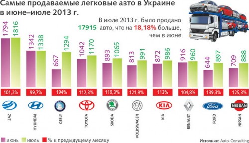 К примеру, объемы реализации Geely в июле увеличились на 94% (до 1,3 тыс. шт.), что позволило китайской марке войти в тройку самых популярных в Украине автомобильных брэндов. Продажи Ssang Yong выросли почти на 145%, Lifan — на 64,7%.