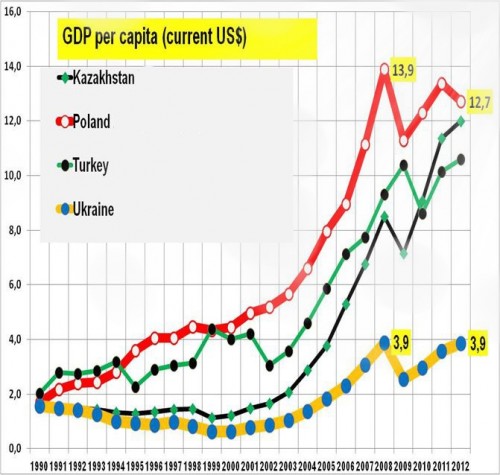Как уверяет нас Мировой банк, в 1990 г. ВВП на душу населения, рассчитанный в долларах США по текущему курсу, у нас и ближайших исторически вечных конкурентов – Турции и Польши – был практически одинаков. Сопоставление Украины с этими двумя странами-соседями объясняется не только во многом общей историей, сколько и общим процветающим будущим, в чем я абсолютно уверен. Будущим, в котором очень не хочется быть самым бедным (как сегодня).