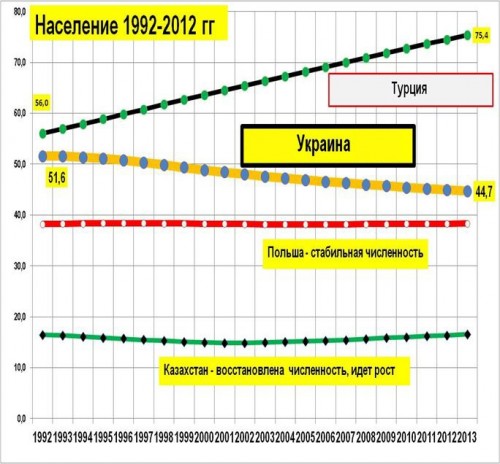 Потрясающее отставание Украины в подъеме уровня жизни после 1990 года сформировало ниже приведенную, весьма унизительную и тревожную динамику численности населения нашей державы (см. График «Население 1992-2012»).