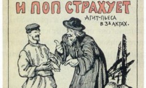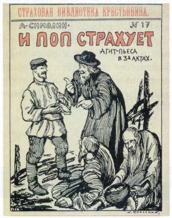Третья пьеса «И поп страхует» (автор А. Симолин), пожалуй, самая неудачная, хотя ее создатель наряду с типичным для всех агиток противопожарным страхованием попытался отрекламировать еще и страхование посевов сельхозкультур. Это уже полностью комедия, фарс, китч. Ее не рекомендовалось ставить в местностях, «где религиозные предубеждения еще очень сильны». Госстрах и церковь представляются в пьесе конкурентами, причем не только в идеологическом смысле, но и в финансовом. Крестьяне думают, куда заплатить деньги: за страхование или попу за совершение обрядов. Выбирают попа, но и молебен не может предотвратить страховые события. Однако «хороший» Госстрах все равно выплачивает возмещение по окладному страхованию, хотя и по самому минимуму (интересно, не боялись ли агитаторы, что таким образом невольно «поспособствуют» увеличению недоимщиков, - зачем вносить взносы вовремя, если все равно Госстрах платит всегда?). А зловредный поп-конкурент, как выясняется, сам-то все свое имущество застраховал добровольно и по полной программе.