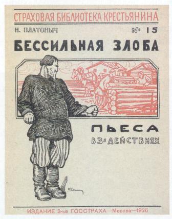 Страховая агитпьеса «Бессильная злоба» (автор Н. Платоныч) отмечена на всесоюзном конкурсе агитпьес. И вполне заслуженно, поскольку сделана очень аккуратно, уши пропаганды, что называется, не торчат: идет сюжет из обычной крестьянской жизни, хотя и не без классового подтекста. По жанру пьеса напоминает скорее всего криминально-бытовую драму, и не без элементов комедии. Главный герой - зажиточный крестьянин Парфен Семенов, пьяница и самодур - судится с родным братом из-за амбара, который братья не поделили при разделе имущества. Суд Парфен проиграл, однако не успокоился и начал вынашивать планы мести. Брат же его - человек победнее, зато самых передовых взглядов - решает защитить себя от угрозы путем добровольного страхования имущества. Лучшее побуждение, как известно, — пример действием. Решение о страховании принимается прямо на сцене на глазах изумленной публики, хотя и преподносится как следствие давних размышлений: «Пойду, застрахую все в Госстрахе». Но в основном крупицы пропаганды вплетены в текст довольно тонко. Реальная доля страхования в пьесе - не более 10%, а остальное — страсти человеческие, вечная тема братской ненависти. Предмет спора - амбар в конце концов сгорает, но он оказывается застрахован, и натравившему поджигателя Парфену остается только запить горькую в бессильной злобе...
