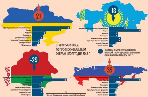 Самые высокие темпы роста показали Россия и Казахстан, число вакансий на рынке которых за первые шесть месяцев 2013 г. в сравнении с аналогичным периодом прошлого года увеличилось на 152?% и 163?% соответственно. Показатели роста белорусского и украинского рынков были значительно скромнее — 122?% и 137?% соответственно. При этом положительной динамика темпов роста оказалась только для Украины (+21?%) и России (+35?%), а рынки труда Казахстана (–13?%) и Беларуси (–29?%) в нынешнем году снизили обороты.