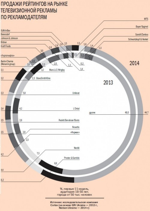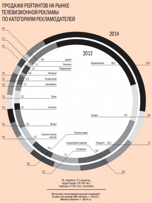 Разные медиасегменты по?разному ощутили на себе кризисные явления текущего года, говорит Алексей Вирко и добавляет, что самая благоприятная ситуация , как и прежде, на рынке телевизионной рекламы. За первые одиннадцать недель 2014 г. общие продажи телевизионных рейтингов выросли по сравнению с аналогичным периодом прошлого года на 5,2?%, свидетельствуют данные исследовательской компании Cortex. При этом увеличили свою рекламную активность Procter & Gamble, «Фармак», Reckitt Benckiser, Novartis, GlaxoSmithKline и др., сократили — Nestlé, L’Oréal, Unilever.