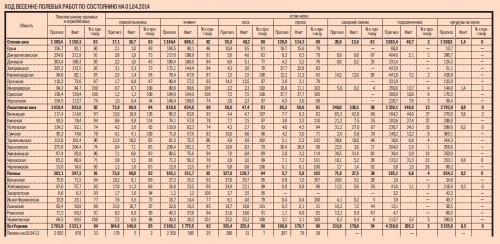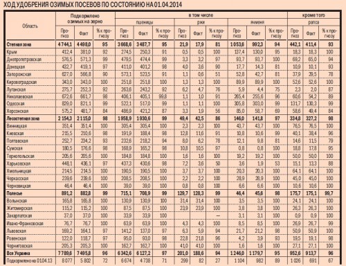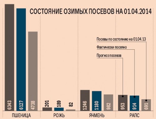 В 2014 г. аграрии соберут не более 55,7 млн т зерновых, что на 6,5?% меньше, чем в прошлом году, прогнозирует директор информационной компании «ПроАгро» Николай Верницкий. По его прогнозам, фермеры соберут 20,3 млн т пшеницы (на 8,5?% меньше), 25,5 млн т зерновых (на 8,2?% меньше), 15,2 млн т масличных (на 5,9?% меньше). При этом ожидается увеличение на 6,1?% валового сбора ячменя — до 7,98 млн т.