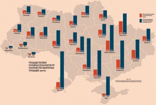 Всего, по данным Минагрополитики, для проведения весенне-полевых работ в 2014 г. необходимо 42,8 млрд грн. «Это на 2,7 млрд грн больше, чем в 2013 г. и почти на 6 млрд грн больше потребностей 2012 г. без учета курсовых колебаний. С их учетом дополнительно нужно свыше 2 млрд грн», — говорит директор департамента финансово-кредитной политики Минагрополитики Баграт Ахиджанов. Увеличение затрат на посевную в аграрном министерстве объясняют ростом цен на топливо, семена и удобрения, расходы на которые составляют 72,6?% необходимых на посевную средств. Причем на эти цели в текущем году необходимо потратить на 2,5 млрд грн больше, чем в прошлом. На минудобрения понадобится 9,1 млрд грн (29,2?%), на топливо и посадочный материал — 6,5 млрд грн (около 21?%), на средства защиты растений — 4,3 млрд грн (13,8?%).