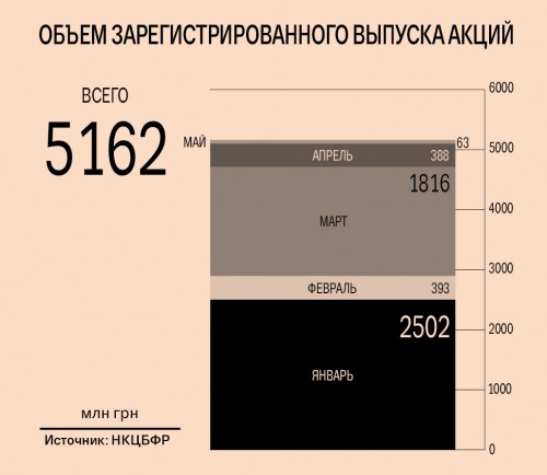 За первые пять месяцев 2014 г. Национальная комиссия по ценным бумагам и фондовому рынку (НКЦБФР) зарегистрировала всего 53 выпуска акций на общую сумму 5,16 млрд грн, говорится в информационном справочнике регулятора о развитии фондового рынка. При этом за аналогичный период 2013 г. объем зарегистрированных выпусков акций предприятий был на треть больше — 16,85 млрд грн.