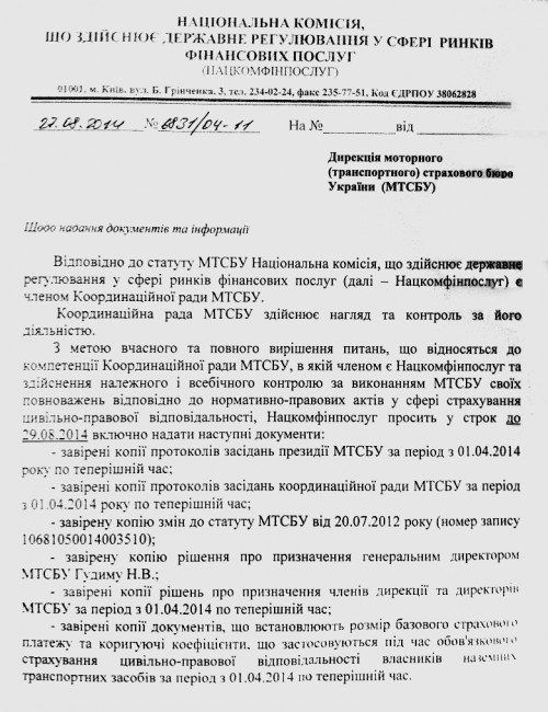 В это же время, пользуясь тем, что Наталья Гудыма находится в отпуске за свой счет, о котором она объявила на заседании Президиума, Нацкомфинуслуг 27 августа за подписью вр.и.о. Максима Полякова (входит в Коордсовет и голосовал за отстранение гендиректора) направила в Дирекцию МТСБУ письмо-запрос с ультиматумом предоставить Регулятору в течение 3-х дней до 29 августа заверенные копии следующих документов (за период с 1 апреля 2014 года):
