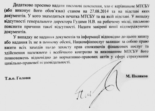 Дополнительно Нацкомфинуслуг попросила предоставить письменные пояснения, кто является руководителем МТСБУ (или выполняет его обязанности) состоянием на 27.08.2014 и на основании каких документов. «У кого находится печать МТСБУ и на каких основаниях. В случае отсутствия генерального директора Гудымы Н.В. на рабочем месте, письменно пояснить причины ее отсутствия. Предоставить заверенные копии подтверждающих документов», — говорится в запросе Регулятора.