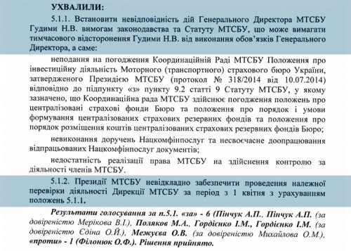 5.1.1. Установить несоответствие действий Генерального директора Гудымы Н.В. требованиям законодательства и Устава МТСБУ, что может потребовать временного ее отстранения от выполнения обязанностей гендиректора