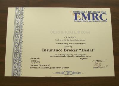 В рамках этого Форума компания ООО «Страховой брокер «Дедал» была удостоена Сертификатом качества EMRC (г. Брюссель,Бельгия) за соответствие качества услуг мировым стандартам.