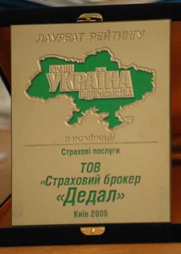Здесь подводились итоги имиджевой программы «ЛИДЕРЫ XXI СТОЛЕТИЯ». За достижения высокого качества и культуры услуг, неизменную ориентацию на интересы клиента и весомый вклад в формирование украинского рынка страховых брокерских услуг компания «Страховой брокер «ДЕДАЛ» была награждена Почетным дипломом «100 ЛУЧШИХ ПРЕДПРИЯТИЙ УКРАИНЫ» в номинации «Страховые услуги».