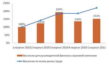 Рис. 1. Динамика количества вакансий для руководителей филиала страховой компании и в целом по рынку труда за 5 кварталов (01.01.2010 – 31.03.2011)