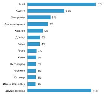 23% вакансий для руководителей филиала страховой компании открыты в Киеве и Киевской области (рис. 2). Значительное количество вакансий также открыто в регионах Одессы (12% всех вакансий), Запорожья (8%), Днепропетровска (7%), Харькова (5%), Донецка и Львова (по 4%).