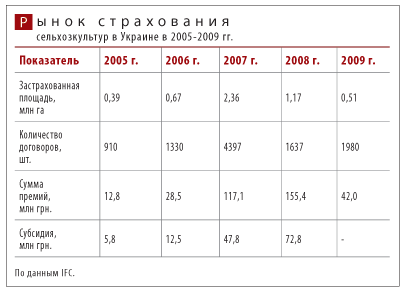 Возможно, последствия этой затяжной зимы не были бы для пострадавших компаний столь ощутимыми, если бы они застраховали риски, как это делают аграрии во всех развитых странах. Однако в Украине инструмент страхования сельскохозяйственных рисков развит крайне слабо. Более того, по оценкам Международной финансовой корпорации (IFC, группа Всемирного банка) в прошлом году, по сравнению с 2008 г., объем рынка агрострахования (с учетом страхования рисков в животноводстве) сократился в 3,5 раза — до 44,1 млн грн. Кроме того, уменьшилось и количество страховых компаний, работающих с агросектором. По данным Василия Назаренко, председателя правления ЗАО “Украинская аграрно-страховая компания” (г.Черкассы; с 1995 г.; 20 чел.), если в 2008 г. агрострахованием активно занимались 58 компаний, то в 2009 г. — чуть больше 15.