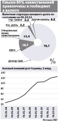 Однако, не привлекая новый долг, не будет возможности обслуживать старый. «Украине сейчас очень нужно привлечь заявленные ранее $1,5 млрд. от выпуска евробондов. Это заверит инвесторов в дальнейшей возможности страны справляться с долговой нагрузкой»,— отмечает экономист Международного центра перспективных исследований Александр Жолудь. Единственным, хотя и не долговременным, плюсом от сжимания долговой петли будет удерживание в течение какого-то периода времени стабильного курса гривни. «Стабильность валютного курса для нас очень важна, поскольку около 50% заимствований, может даже больше, у нас привлечены в госбюджет в валюте»,— заявил первый заместитель министра финансов Анатолий Мярковский.
