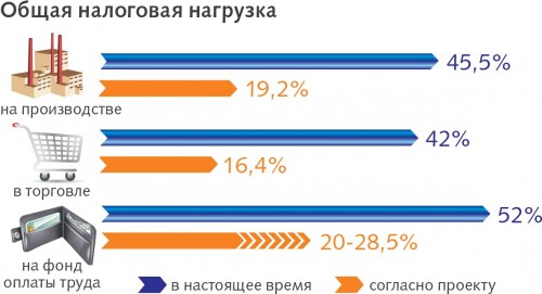 Главным стимулом по выведению зарплат из тени должно стать предложенное ГНС уменьшение размера единого социального взноса с 32,6–49,7% в зависимости от категории предприятий до 18,6%, а также равное его распределение между работниками и компанией (сейчас со своих зарплат сотрудники отчисляют в социальные фонды не более 15%, остальное платит работодатель).