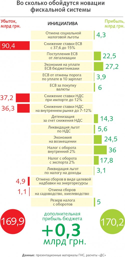 Новации, по подсчетам ГНС, могут уменьшить поступления в бюджет на 73,5 млрд грн. Компенсировать эти потери предполагается за счет полной ликвидации практически всех льгот (в том числе и для "упрощенцев"), а также внедрения более прозрачного налога с оборота. "Эти предложения автоматически уничтожат всю систему единого налога, а вместе с ним и сотни тысяч легальных рабочих мест. Кроме того, из-за введения обязательного для всех НДС сразу подорожают целые группы социально значимых товаров", — подчеркивает глава Всеукраинского объединения предпринимателей малого и среднего бизнеса "Фортеця" Оксана Продан.