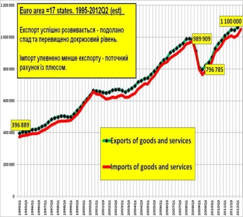 5. И после этого мы наблюдаем довольно таки уверенный рост этого важнейшего, дающего наибольший приток инвалюты, показателя. В последнем отчетном квартале, 2 кв. 2012 г. экспорт товаров и услуг по оценке автора составил не менее 1’100 млрд. евро это при том, что в Еврозоне 332 млн. жителей. Для сравнения: Украина, с населением, еще (!) несколько превышающим 45 млн. чел., поднатужившись, экспортировала товаров и услуг во 2 кв. 2012 г. на где-то 17-18 млрд. евро.