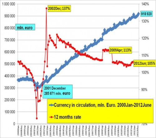 Пройдя свое наименьшее значение в декабре 2001 г., опустившись до уровня 287 млрд., эти денежки уверенно и гладко росли и на конец июня 2012 г. добрались почти до уровня 919 млрд. На фоне того, что нам не дает МВФ, это просто колоссальные цифры. Но хотелось бы, чтобы читатель сравнил эти цифры с размерами тех сумм, которые реально идут на поддержку южанам. Предвосхищая Ваше возможное удивление, скажу, что эта поддержка в виде живых денег составляет лишь несколько процентов от суммы евро находящегося в обращении. Так что, нам бы проблемы стран Еврозоны…