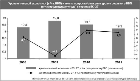 Видимо, эти оценки (менее четверти заложенного в бюджете прогнозного значения номинального ВВП на нынешний год — около 1,5 трлн. грн.) являются сильно заниженными. Стоит лишь вспомнить, что согласно последним опубликованным официальным правительственным данным доля теневого сектора в 2010 году составляла около 38% официального ВВП, увеличившись после наступления кризиса более чем на десять процентных пунктов. А последние оценки, например, Всемирного банка были еще менее оптимистичными — по подсчетам его экспертов, доля неформальной экономики в Украине составляла около 50%.