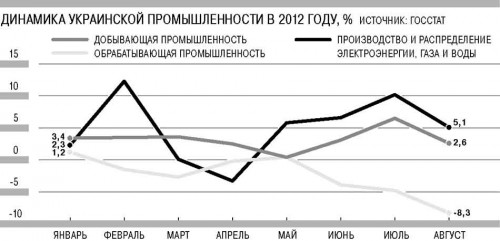 На падение производства жалуются даже в тех отраслях, где, по расчетам Госстата, наблюдается рост. В химической отрасли его темпы достигли 12,8%, но президент "Украгрохимхолдинга" Сергей Лисковский говорит, что реальная ситуация хуже. "Я не буду говорить о всей отрасли, но химия сложных удобрений в полном упадке. Нас теснят россияне и казахи, поскольку у них стоимость сырья и энергоресурсов в 2,7 раза ниже, чем у нас. Предприятия останавливаются, что делать дальше — непонятно",— заявил он, уточнив, что подобная ситуация наблюдается и на предприятиях, выпускающих азотные удобрения.