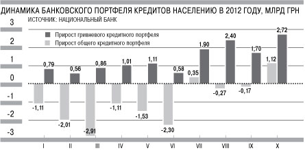 Развивается исключительно краткосрочное кредитование. "Акционеры многих банков пересмотрели свои стратегии, их учреждения почистили и продали свои кредитные портфели. Многие четко определились с сегментами, в которых они хотят работать с населением. На рынке практически нет ипотеки, кроме госпрограммы, слабое автомобильное кредитование. Однако активно развиваются карточные займы и потребительское кредитование",— отмечает председатель правления банка "Хрещатик" Дмитрий Гриджук. Интерес банков к выдаче коротких займов неудивителен, учитывая их высокую доходность. По данным компании "Простобанк Консалтинг", средняя ставка кредита наличными — 56,3%, на товары — 60,6%. До конца года темпы прироста розничного портфеля сохранятся. "Потребность в розничных займах носит сезонный характер. В конце года, как правило, происходит всплеск спроса, потому что люди покупают подарки и готовятся к праздникам",— говорит Грег Краснов. За январь-октябрь портфель гривневого кредитования вырос на 15,7%, в том числе в октябре на 2,9%. По итогам 2012 года розничный гривневый кредитный портфель может вырасти на 20%.