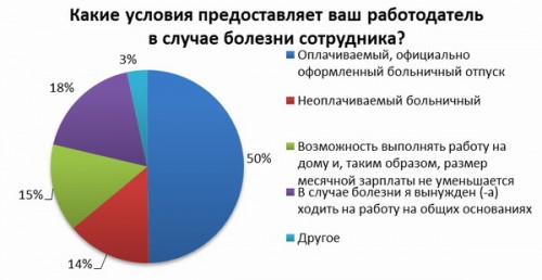 Также, по данным rabota.ua, в случае болезни сотрудника, оплачиваемый и официально оформленный отпуск предлагают лишь 50% работодателей. 18% украинцев вынуждены пребывать на рабочем месте, несмотря на плохое самочувствие. А 15% работников имеют возможность выполнять свои обязанности на дому в том случае, если их самочувствие не позволяет появиться на работе.