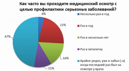 При этом в rabota.ua сообщают, что почти 50% украинцев обращаются к врачу только в случае крайней необходимости, то есть ежегодные и более частые медосмотры в их практике не случаются. Лишь каждый пятый украинец раз в год посещает врачей с целью профилактики заболеваний, 16% украинцев, по данным опроса, проходят медосмотр раз в несколько лет.