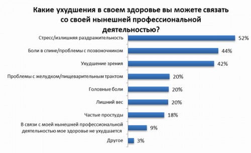 Тем временем, работа самым непосредственным образом сказывается на нашем здоровье: более половины респондентов постоянно пребывают в стрессовом состоянии, 44% менеджеров жалуются на боли в спине и проблемы с позвоночником, а 42% опрошенных в связи со своей работой наблюдают ухудшение зрения. Каждый пятый работающий украинец сетует на проблемы с желудком/пищеварительным трактом, головные боли или лишний вес.