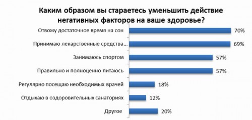 Портал rabota.ua выяснил также, как все-таки украинцы нивелируют влияние негативных факторов работы на свое здоровье. Выяснилось, что 70% респондентов просто стараются высыпаться, 69% - укрепляют иммунитет витаминами и иммуностимуляторами. 57% справедливо полагают, что залог здоровья - это регулярные занятия спортом, столько же украинцев делают ставку на правильное и полноценное питание.