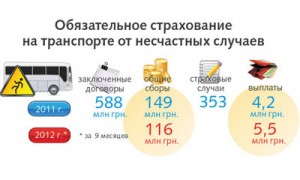 Страхование от несчастного случая является обязательным для всех пассажиров, пользующихся услугами железнодорожного, морского, внутреннего водного, автомобильного или электротранспорта (за исключением внутреннего городского). Цена полиса входит в стоимость железнодорожных, автобусных и прочих билетов и составляет от 1,5 до 3% их стоимости. Наличие страховки должно гарантировать путешественникам выплату в размере 6 тыс. необлагаемых налогом минимумов (на данный момент — 102 тыс. грн.), если во время поездки с ними произойдет несчастный случай. В действительности транспортная "обязаловка" давно превратилась в фикцию. Ежегодно в Украине заключаются порядка 600 млн договоров страхования пассажиров. Однако большинство путешественников даже не подозревают, что они застрахованы.