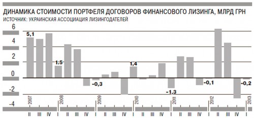 Объем новых договоров, заключенных лизинговыми компаниями в январе-марте, сократился по сравнению с I кварталом 2012 года почти на 38%, до 1,73 млрд грн, а их количество — на 40% (до 2209 договоров), сообщили в пятницу в ассоциации "Украинское объединение лизингодателей". И хотя в сравнении с началом 2013 года лизинговый портфель также уменьшился — на 0,2 млрд грн, до 41,3 млрд грн, по сравнению с 1 апреля прошлого года динамика портфеля остается положительной (+7,8 млрд грн).