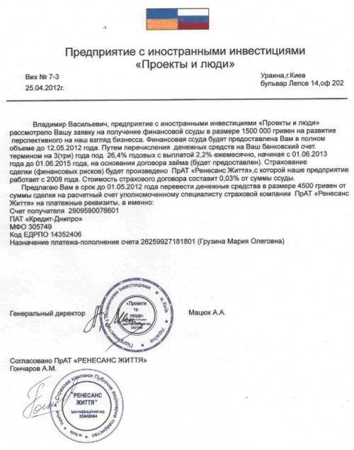 ЧАО «Ренессанс Жизнь» предупреждает о письмах от так называемого «Предприятия с иностранными инвестициями «Проекты и люди», которые информируют адресатов о возможности получения крупной финансовой ссуды посредством оплаты суммы страхового взноса уполномоченному специалисту ЧАО «Ренессанс Жизнь» с целью страхования финансовых рисков.