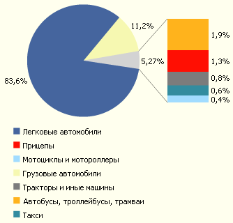 За четыре с половиной года действия ОСАГО объем страховой премии по легковым автомобилям составил 222,4 млрд руб. (83,6% от совокупной страховой премии), объем страховой премии по грузовым автомобилям составил 29,9 млрд руб. (11,2%), на автобусы, троллейбусы и трамваи пришлось 5,2 млрд руб. (1,9%), на прицепы – 3,5 млрд руб. (1,3%).