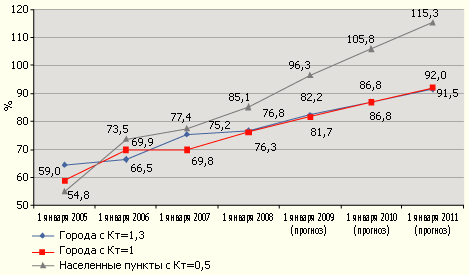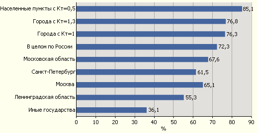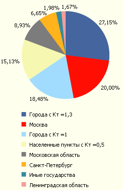 С июля 2003 года по декабрь 2007 года объем страховой премии по городам с Кт=1,3 составил 72,2 млрд руб. (27,2% от совокупной страховой премии), по Москве – 53,2 млрд руб. (20,0%), на города с Кт=1 – 49,2 млрд руб. (18,5%).