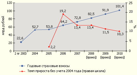 Прогноз страховых взносов выполнен на основе линейного тренда, построенного без учета взносов за второе полугодие 2003 года и 2004 год.