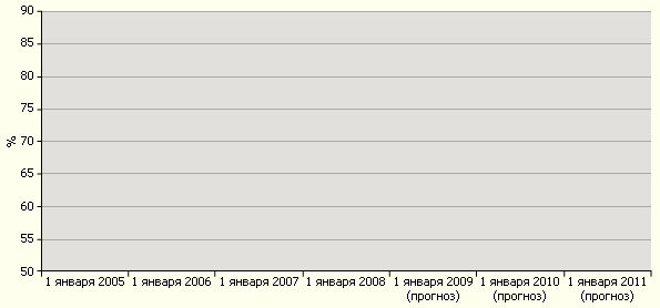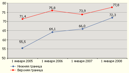 Прогноз динамики нижней границы годового коэффициента убыточности построен с помощью линейного тренда без учета данных на 1 января 2005 года. Прогнозирование верхней границы годового коэффициента убыточности математическими методами не представляется возможным.