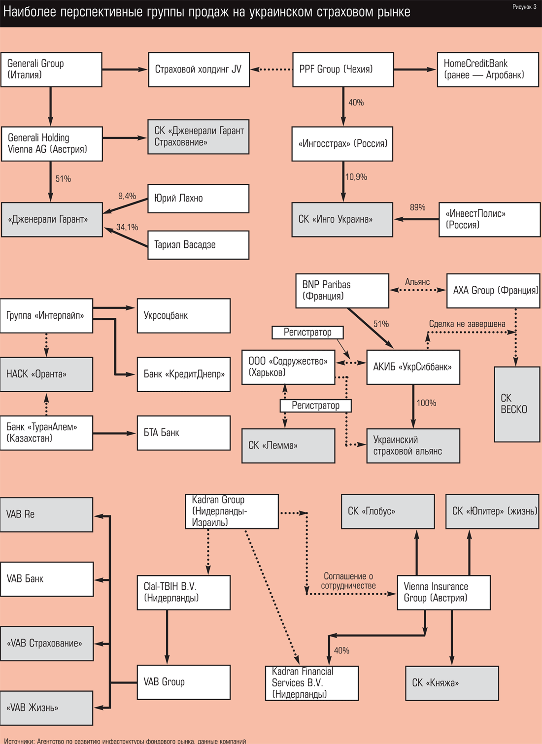 К пулу продаж, который только формируется, можно отнести группу УкрСиббанка. Третий по величине активов отечественный банк уже контролируетстраховую компанию «Украинский страховой альянс». До конца года должна завершиться сделка по приобретению компании ВЕСКО, о чем договорились французская АХА (партнер BNP Paribas) и УкрСиббанк. Если транзакция состоится, то на украинском рынке заработает новый тандем, способный отхватить серьезный кусок розничного пирога на страховом рынке страны, в том числе используя ресурсы филиальной сети УкрСиббанка.