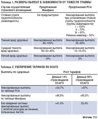Алексей Кудрин также предлагает такое нововведение, как фиксированные выплаты по факту травмы, а также возмещение расходов на лечение, превышающих фиксированную выплату. Но РСА и Минфин разошлись во взглядах на объем выплат в зависимости от вида травмы (см. таблицу 1 на с. 8). Например, за тяжкий вред здоровью Минфин считает необходимым выплачивать от 80 до 100% фиксированной суммы, а РСА всего 25—30%. Зато страховщики предлагают ввести компенсации за различные группы инвалидности, чего нет в предложениях министерства.