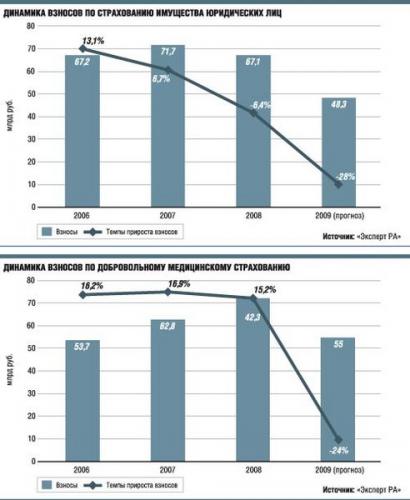 Прогнозы представителей страховых компаний относительно динамики полученной страховой премии по страхованию крупного и среднего бизнеса в 2009 году крайне разнородны и находятся в интервале от 0 до минус 30%. По оценкам «Эксперт РА», объем спроса на корпоративное страхование в 2009 году упадет на 25%. В том числе взносы по страхованию имущества юридических лиц от огневых и иных рисков сократятся на 28%, по добровольному медицинскому страхованию — на 24%. В числе основных причин снижения спроса можно назвать сокращение объема производства, внешнеторговых операций, падение объемов грузоперевозок, нехватку оборотных средств у предприятий, жесткое сжатие рынка корпоративного кредитования и лизинга, снижение рентабельности производства.