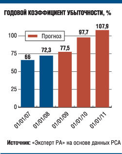 По подсчетам «Эксперт РА», на 1 января 2008 года годовой коэффициент убыточности по рынку ОСАГО составил от 72,3 до 77,8%, в зависимости от методики расчета. К 1 января 2009 года коэффициент убыточности может составить уже от 77,5 до 80%. «Это грозит разорением уже не только небольшим страховщикам, работающим в наиболее убыточных регионах, но и крупным участникам рынка, продающим полисы ОСАГО на всей территории России, — отмечают аналитики «Эксперт РА». — Без адекватного увеличения тарифов это может привести к кризису системы ОСАГО».