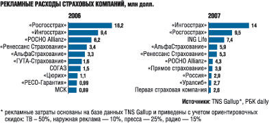 При этом исходя из данных TNS Gallup (с учетом скидок) в 2007 году десять страховщиков — крупнейших рекламодателей потратили на рекламу 35,9 млн долл., или 44% от общих затрат, а в 2006 году — 43,3 млн долл., или 80,3%. Больше всех в 2007 году потратили «Ингосстрах» (13,9 млн долл.), «Росгос-страх» (9,5 млн долл.), ING Life (7,4 млн долл.), «АльфаСтрахование» (5,9 млн долл.) и «Ренессанс Страхование» (5,3 млн долл.). При этом ING Life, занявшая третье место, вышла на рынок только в прошлом году. Впервые с телерекламой на рынок вышли «Прямое страхование», «Уралсиб» и ВСК, потратившие на нее 2,3 млн долл., 2 млн долл. и 1,6 млн долл. соответственно.